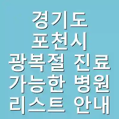 8월 15일 광복절에 포천시에서 진료를 받을 수 있는 병원을 찾고 계신가요? 이 글에서는 포천시 내에서 광복절에도 진료를 제공하는 병원 목록과 각 병원의 진료 과목, 운영 시간에 대한 정보를 소개합니다. 특히, 응급 상황이나 갑작스러운 질병으로 인해 병원을 찾아야 할 때, 유용한 정보를 제공하고자 합니다. 이 글을 통해 포천시의 진료 가능한 병원을 쉽게 찾아보실 수 있을 것입니다.