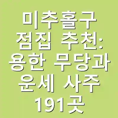 미추홀구에서 추천하는 점집으로는 여러 곳이 있지만, 특히 유명한 곳 중 하나는 ‘선녀보살’입니다. 이곳은 사주와 신점을 모두 제공하며, 상담 후 많은 고객들이 긍정적인 후기를 남기는 곳으로 알려져 있습니다. 또한, ‘청룡사’도 인기 있는 점집으로, 다양한 유형의 상담을 통해 고객의 고민을 해결하는 데 도움을 주고 있습니다.