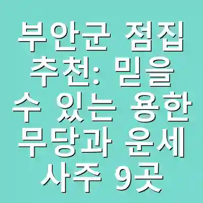 부안군에는 다양한 점집들이 존재하여 각기 다른 상담 방식을 제공합니다. 이 글을 통해 신뢰할 수 있는 용한 무당과 점집을 선택하는 데 도움이 되는 정보를 제공했습니다. 부안군의 점집에서 자신의 운세를 확인해보세요.