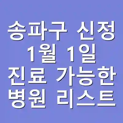 2026년 1월 1일, 신정 연휴에 갑작스러운 질병이나 증상으로 인해 병원에 가야 하는 경우가 생길 수 있습니다. 송파구에서 정상 진료가 가능한 병원 리스트를 미리 확인해 두면 혼란스러운 상황에서 빠르게 대처할 수 있습니다. 이 글에서는 송파구 내에서 진료 가능한 병원들에 대한 정보와 활용 방법을 안내합니다. 이를 통해 긴급 상황에 대비하고, 보다 효율적으로 의료 서비스를 이용할 수 있는 방법을 익혀보세요.