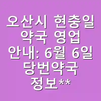 오산시의 6월 6일 현충일 약국 영업 정보는 시민들에게 매우 유용한 자료가 될 것입니다. 이 정보를 통해 비상시에 필요한 의약품을 쉽게 확보하고, 건강을 지킬 수 있도록 하시기 바랍니다. 현충일의 의미를 되새기며, 약국 이용 시 유용한 정보를 기억하고 활용하세요.